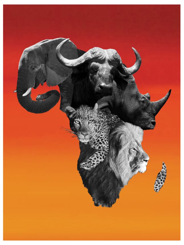 African Sunset Background with Big 5 Safari Animals in Africa Shape